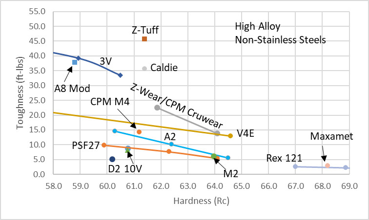 I think the superior toughness of 4V is due to the minor differences in composition leading to lower “carbon in solution” rather than superior processing technology by either company. However, this comparison illustrates that B-U steels do not necessarily have superior toughness.