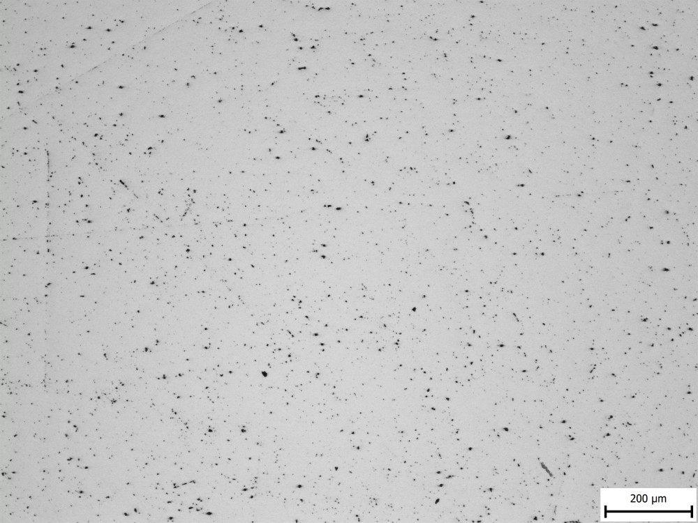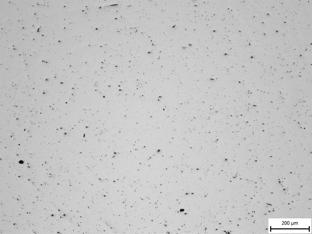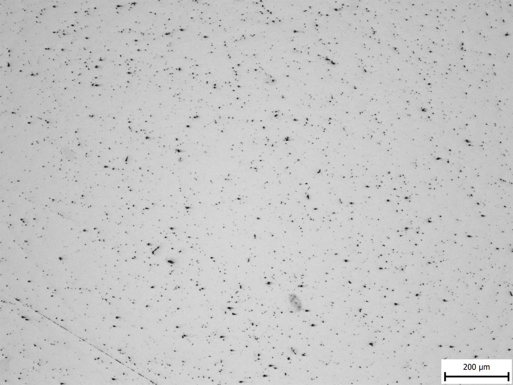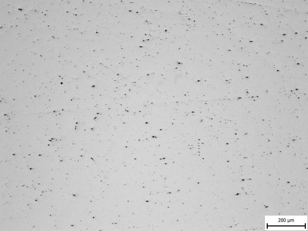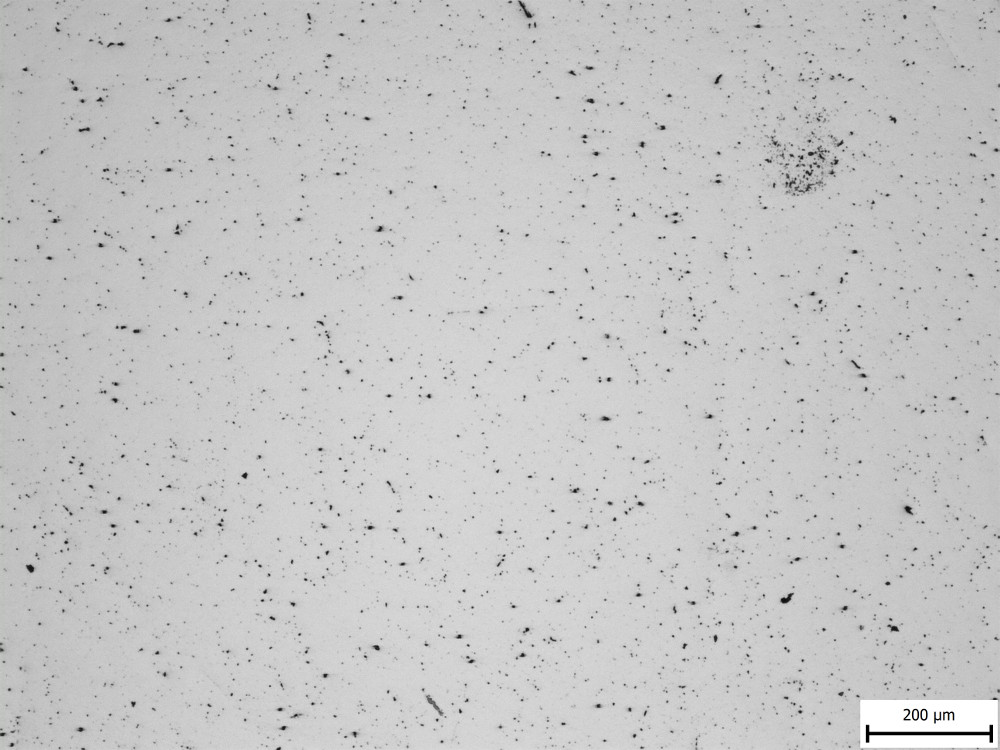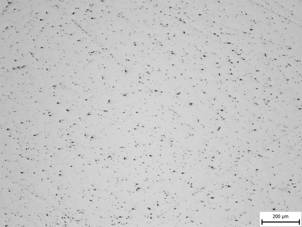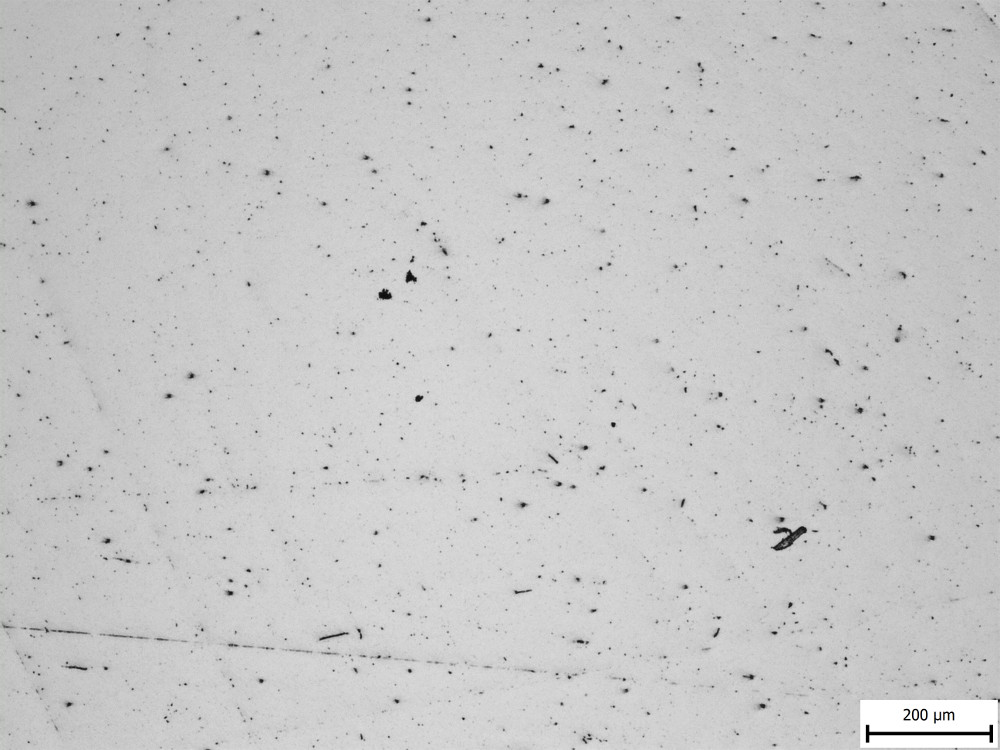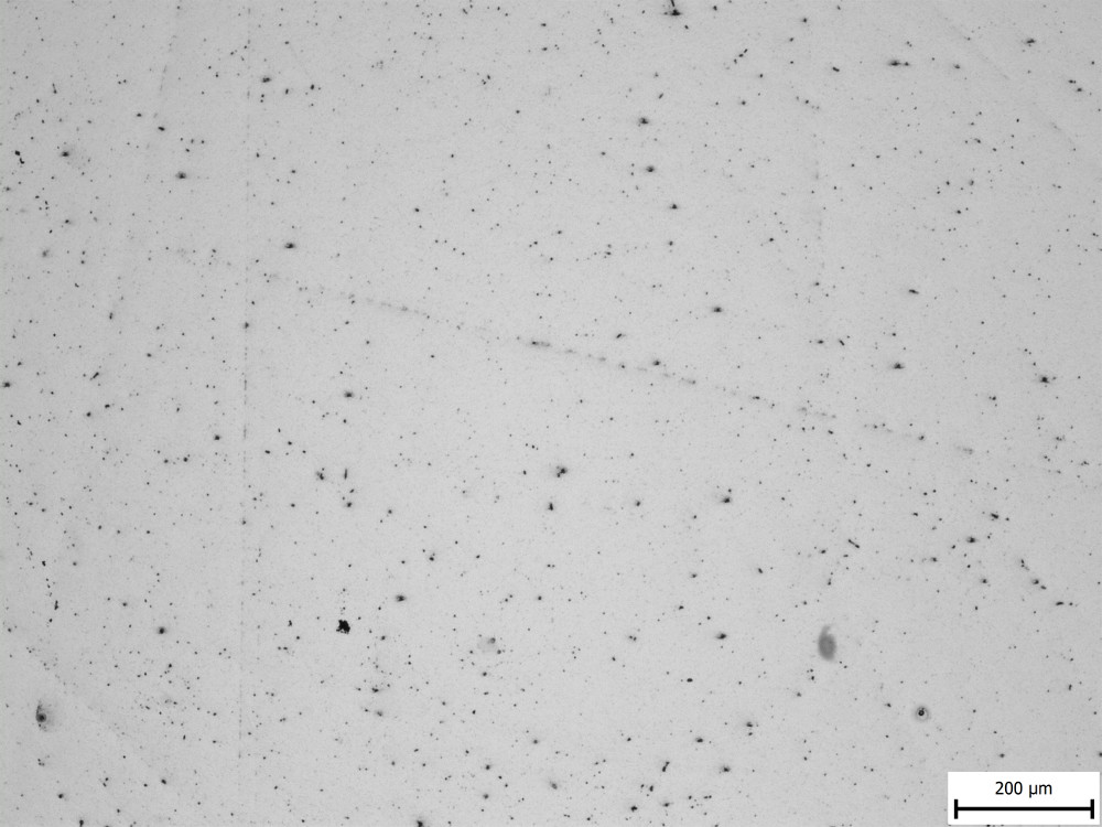 They counted inclusions that were larger than 11 microns, and even in the “bad” example of Crucible steel they still measured less than one inclusion of such a size per square centimeter, which is a relatively large area in microstructure terms. So I am showing two images from each steel to get a slightly better feel of the inclusions, at the lowest magnification the microscope had: