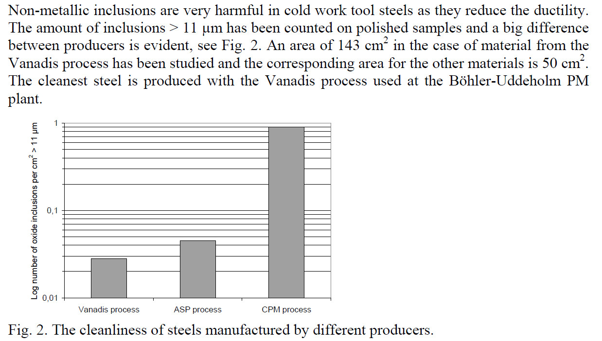 Erasteel and Bohler-Uddeholm have newer powder metallurgy production facilities that allow a reduction in oxygen content of steel. Bohler-Uddeholm and Erasteel also reportedly produce a finer powder size but this does not result in a significant change in carbide size because the limitation in carbide size is coarsening during processing rather than the size of the structure in the powder. The composition of the steel has a much greater affect on carbide size than the powder metallurgy manufacturing technology. The oxygen content was confirmed to be reduced in Bohler-Uddeholm steels relative to Crucible and Carpenter, but a resulting reduction in toughness was not seen in testing. Therefore I think that steels can be purchased from any of these companies without worrying about missing out on “3rd generation” technology advantages.