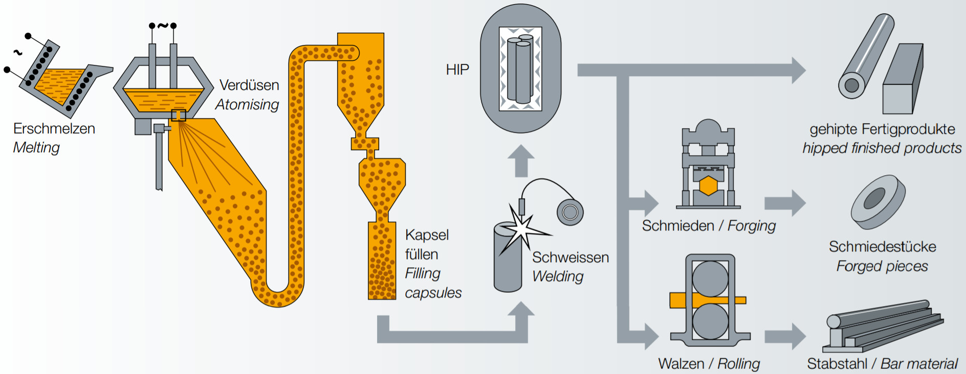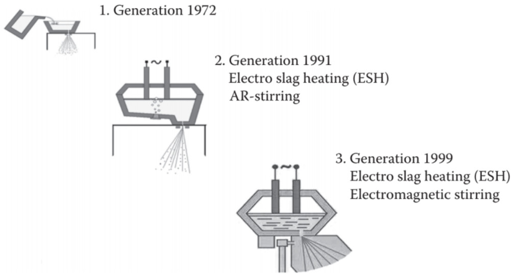 When Bohler-Uddeholm built their plant around 1999 they used a very similar process but instead of argon gas stirring they used electromagnetic stirring which is somewhat superior to argon stirring. The B-U process also directly encapsulates the powder for the HIP process to avoid effects of handling powder, since sand and other impurities can end up in the powder, and the high surface area powder is prone to oxidation. The finer powder size results from a reduced nozzle size for a slower atomization process which provides fine powder without requiring sieving. The heating of the tundish with electrodes allows the longer process to take place for the finer powder.