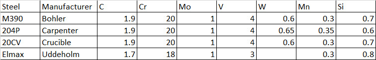Another interesting difference is the higher Co content in the Bohler-Uddeholm steels, and the relatively high tungsten content in Elmax which is not an intentional addition according to the datasheet. Typically recycled steels have less than 0.1% tungsten. This higher Co and W content may mean than Bohler-Uddeholm is using some percentage of recycled high speed steels that Carpenter and Crucible are avoiding. High speed steels are more likely to be alloyed with Co and W. However, the amount of those elements probably has little effect on the final properties.