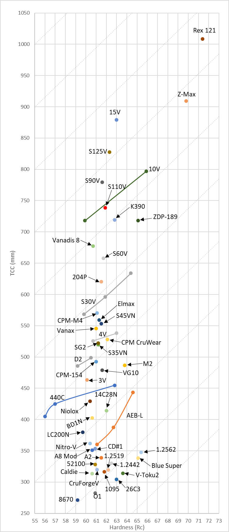 I expected a bit more separation between 4V and CPM-CruWear because the two have similar carbide content, but 4V is entirely vanadium carbide while CPM-CruWear has a mix between the two. I’m not sure why they are so close together despite that fact.