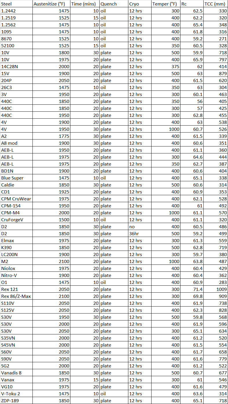 Below shows a chart summarizing all of the steels and heat treatments which were utilized, along with the measured edge retention on the CATRA tester in mm. All of the steels were given a cryo treatment after quenching except for one D2 knife which was made to compare the effect of cryo. All of the low alloy steels were quenched in Parks 50 oil and all of the high alloy steels were “plate quenched” between 1″ thick aluminum plates. A plate quench is a bit faster than cooling in air (despite the steels being “air hardening”) and the plates help keep the steel flat. I was targeting 61-62 Rc for most of the knives apart from a few that are basically never used at that hardness, such as ZDP-189, Rex 86, Rex 121, 1.2562, and Blue Super. Because my experience with heat treating each steel varies, and there is always some variation in hardness, the resulting hardness for most steels was between 60 and 63 Rc.