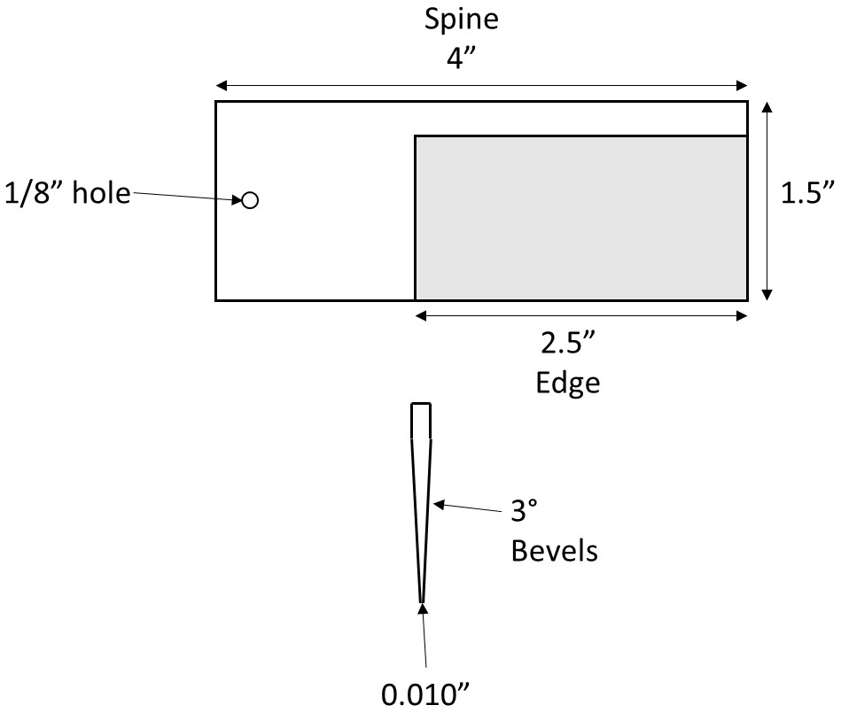 The edge angle can be relatively easy to change with sharpening. However, thickness behind the edge, the angle of the “primary bevel” behind the edge, and the shape of the edge can all affect the result. And different knife companies will heat treat steels to different hardness levels using different heat treatment parameters such as some using cryogenic processing and others not. So I decided to make a simple test knife design which utilizes a rectangular shape (straight edge so curves do not affect cutting) with a consistent primary bevel and edge thickness. Keeping the primary bevel the same means that steel of different thickness can be used, only the height of the primary bevel changes based on the stock thickness.