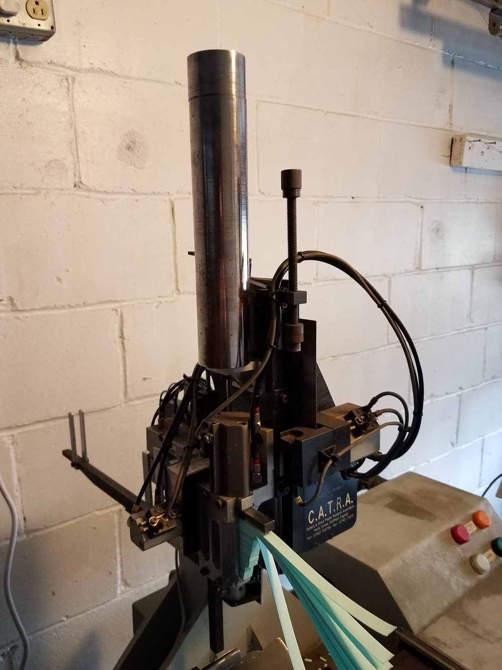 On the other hand, some components of the machine are simpler than I would have thought. The 50 Newton force is maintained by a big steel cylinder on top of the head of the machine. Also the paper comes loose as 10mm wide strips, and they must be stacked together by hand and inserted into the machine which is somewhat tedious.