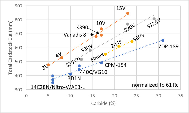 In general, steels with higher vanadium did better, as expected. Vanadium carbide is very hard so it contributes to wear resistance and edge retention very strongly. These values are normalized to 61 Rc by using the 15.8*Rc regression.