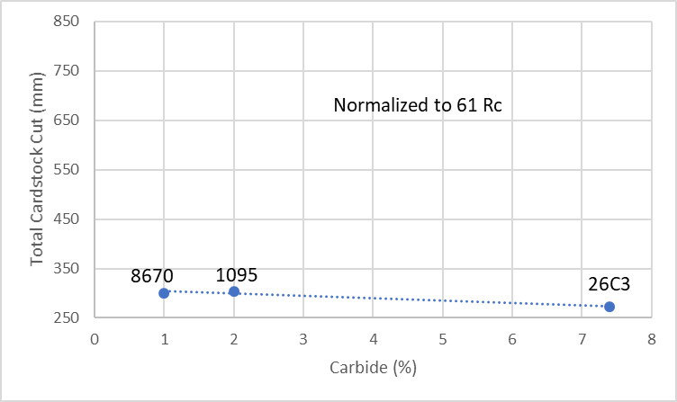 I don’t think the cementite is actually reducing edge retention. It is more likely that the negative trend is random within the variation inherent in the test. However, it is a bit puzzling that the cementite isn’t contributing to edge retention at all. Many sources show silica as being higher in hardness than cementite [5]. It could be that with the cementite being softer than silica that the cementite is not improving edge retention. With a different test media it may be that more differentiation would be found between the cementite-containing steels. The relative position of the low alloy steels wouldn’t change much vs other steels, however, as the softer carbide still contributes less to edge retention. Currently most of the low-alloy steels seem to be affected only by the bulk hardness of the steel rather than carbide content. This would be my guess as to why O1 tested a bit lower than 1095; the two steels probably perform similarly but due to experimental variability or some small unknown factors the O1 slightly underperformed.