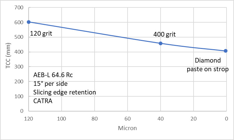 Steve Elliot followed this all the way down to 0.25 micron diamond mechanically measuring cut resistance and found no difference between steel types. I did a durability test in wood, and found no difference in sharpness, but did find a perceptible difference in cut resistance at same sharpness and same angle (surprisingly). oil hardening steel was in the middle of the pack for cut resistance, high chromium steels less resistance, and for some reason, 3V and particle M4 had greater cut resistance even at very high sharpness. Something about their surface (is it the vanadium? I don’t know) creates more friction, which is initially perceived at lower sharpness, but by my most reasonable test of sharpness – how thin of a shaving they can lift off of wood, there was no difference.