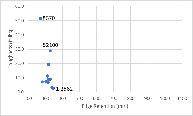 Low alloy steels typically used by forging bladesmiths can have good toughness but the wear resistance and edge retention is relatively low due to the lack of hard carbides. 8670 is a good choice for high toughness and 52100 has a decent balance of toughness and edge retention. At this point I haven’t measured enough of an improvement in edge retention with the vanadium/tungsten-alloyed steels like 1.2519, CruForgeV, 1.2562. Blue Super, 1.2442, etc. to recommend them over 52100. However, 1.2562 is the best that has been tested so far, with Blue Super being pretty similar.