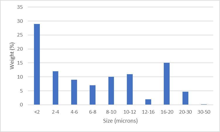 S110V did worse than S90V despite being a similar steel but with higher carbon, chromium, and niobium, which should result in more carbide and more high hardness carbides. I don’t really know the reason for this reduced edge retention compared with S90V. A similar result was found in the dataset I analyzed in this article though I did not report specific results in that article due to the request of the manufacturer who performed the tests. The only reason I can think of is the finer microstructure of the S110V which may be just fine enough to reduce the contribution to edge retention at least with the silica-impregnated paper. Maybe that is also why Vanax is somewhat worse than S30V. When comparing CPM-154 and 154CM the results were basically identical as reported here. The carbides in CPM-154 are of course smaller than 154CM but are still larger than the carbides in Vanax and S110V. Perhaps when the carbides are even smaller they are not as effective with the size of silica present in the paper. If the carbides are smaller than the silica they would be expected to not contribute as much to edge retention. However, I am not sure if there is a good test I can perform to check this and it is only a guess at this point. When I asked CATRA about the size of the silica they gave me the following size distribution. Comparisons between the silica size and carbide size is not easy as the distribution is somewhat complex; the median silica size is less than 2 microns but the average is about 8 microns.