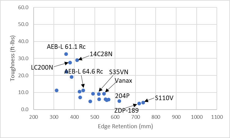 AEB-L, 14C28N, and LC200N have a pretty decent edge retention-toughness balance though at relatively low levels of edge retention. There is then a big drop in toughness down to the rest of the stainless steels which seem to top out around 10 ft-lbs. There is a hole in available stainless steels in terms of steels with toughness in the 15-20 ft-lbs range with enhanced edge retention compared with AEB-L and LC200N.
