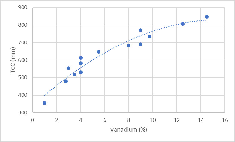 For low-alloy steels at the bottom of the chart, they have cementite (iron carbide) rather than chromium or vanadium carbides. In that case there was no trend with increasing carbide content. If anything it was slightly negative:
