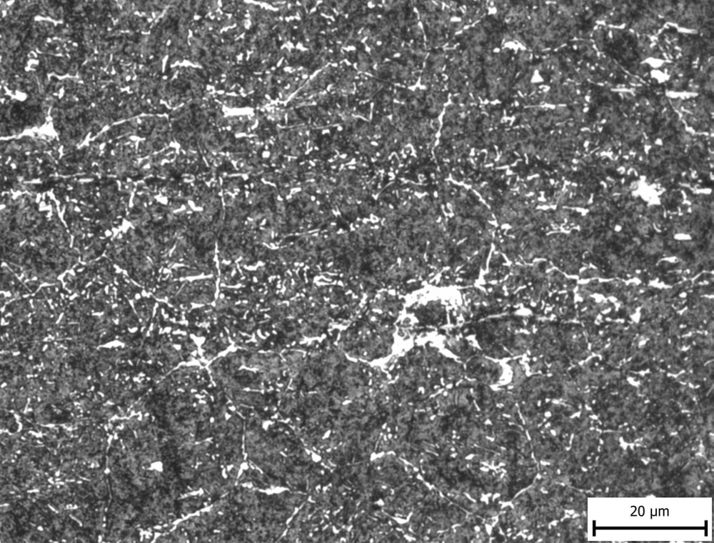 No grain boundary carbide was observed in the micrographs shared by Marco, showing that the “thermomechanical processing” (temperature plus forging) led to the elimination of those carbide networks. There were still regions of larger carbides, especially when found in bands in the steel. Perhaps with a higher initial forging temperature those larger carbides could be eliminated, as Thermo-Calc predicts that the tungsten carbides would be dissolved at about 2075°F.
