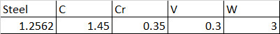 1.2562 along with its American counterpart F2 are probably the highest wear resistance low alloy steels. The steel gains its wear resistance due to the higher carbon for higher content of cementite (iron carbides) but especially the tungsten addition which leads to tungsten carbides (WC) which are high hardness carbides that contribute to wear resistance. I wrote about tungsten-alloyed low alloy steels in this article which covered other steels like Blue Super, 1.2519, and O7. The low overall alloy content of 1.2562 makes it well-suited for forging, you can read more about what makes a steel easier or more difficult to forge in this article.