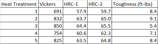 The hardness of each specimen was measured with Vickers and with Ultrasonic Contact Impedence (UCI). I will show both the Vickers value and a conversion to Rockwell C. Conversions between hardness scales is never perfect but gets into the right ballpark. I used two different conversion scales for hardness which are shown as HRC-1 [2] and HRC-2 [3]. The HRC-1 value comes from a hardness conversion from Professor Paul Beiss who created it by using with a large database of values taken with high hardness high speed steels. The HRC-2 value comes from the standard ASTM conversion which agrees better with Marco’s UCI hardness measurements. Three toughness specimens were tested and averaged for each heat treatment which is also shown.