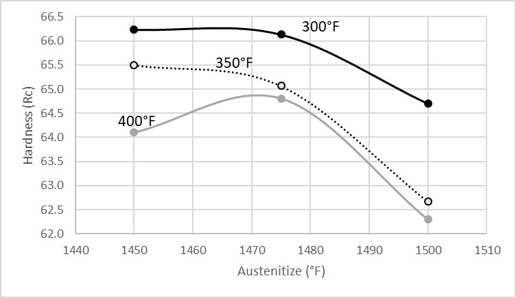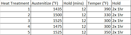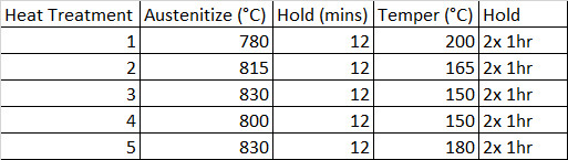 The hardening response was surprisingly lower than in the specimens that I heat treated, such as heat treatment 4 which used 1475°F and a 300°F temper which resulted in about 60.6-62.3 Rc where instead I got over 66 Rc. Higher hardness values were instead seen when austenitizing at about 1500°F. 1500°F was where I was seeing a drop in hardness, presumably due to excess retained austenite. I used hold times of 10 minutes and Marco used 12 minutes, and neither of us used cryo in heat treating.