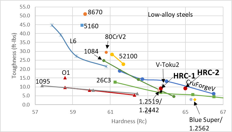The best heat treatment, #2, in particular looks much better than my toughness measurement, resulting in values that look close to what was achieved with CruForgeV, 1.2519, 1.2442, and V-Toku 2. I have noted both HRC-1 and HRC-2 values because of the uncertainty with hardness conversion.