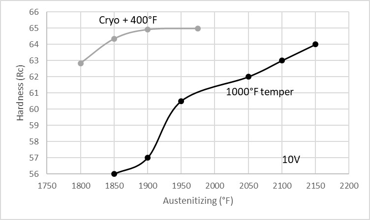 The relatively low molybdenum content in 10V means that hardness values are significantly lower when using high temperature tempering (~1000-1050°) when compared with low temperature tempering (300-500°F). Read this article for more on tempering. High temperature tempering is often preferred in datasheets because retained austenite is greatly reduced without using cryo, and because it gives the steel better tempering resistance during machining and other operations. However, with 10V the low temper allows a reduced austenitizing temperature where there is less grain growth and lower carbon in solution for better toughness, see this article on austenitizing for more information. When using low temperature tempering, austenitizing temperature should be restricted to no higher than 1950°F, and somewhat lower without cryo.