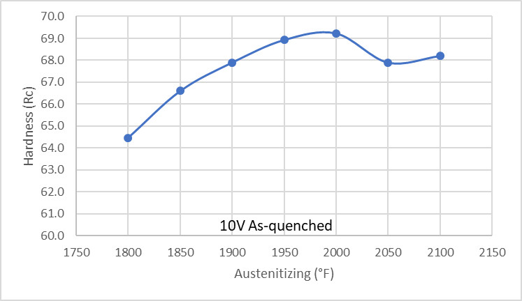 10V can be heat treated to very high hardness levels “as-quenched,” and hardness is likely roughly the same with a 300°F temper. This provides the steel some flexibility as it can be heat treated to a bit lower hardness for higher toughness or high hardness for extreme cutting knives. The values below used a 30 minute austenitize, plate quench, and cryo treatment in liquid nitrogen.