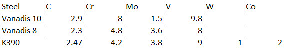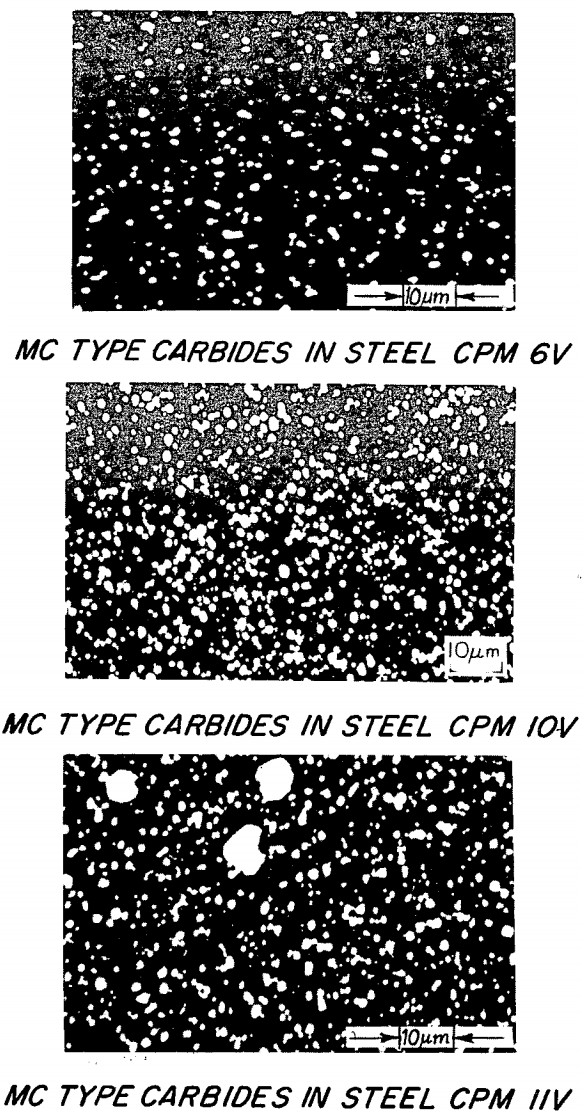 They looked at a range of different vanadium contents and found that above around 10% vanadium, the carbide size would be increased, reducing grindability and toughness. With not much more than 10%, the toughness would be reduced to the same level or lower as conventional (non-PM) 4-5% vanadium steels like M4 and A7 which would make 10V less desirable.