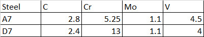 Has D7 been used in any knife blades? Seems the high Cr would give interesting properties. I’m drawn to cruwear due to its relatively high Cr for a tool steel, for example.