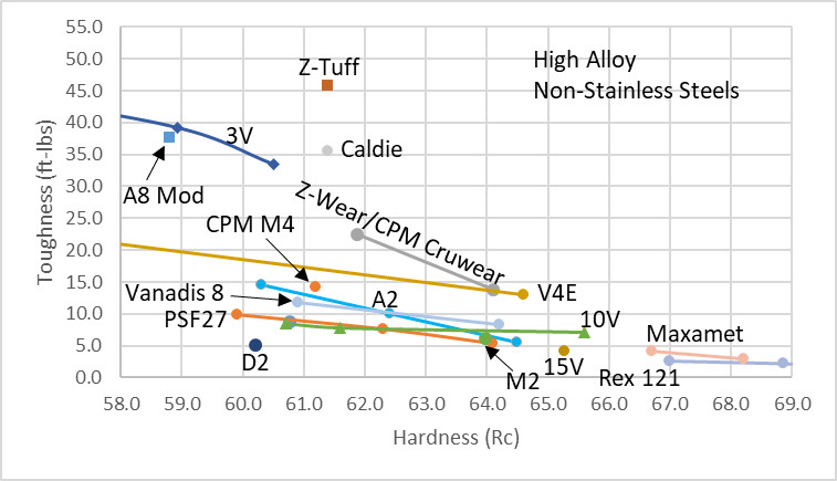 CPM-10V was assigned the standard grade name of AISI A11. This was one of the last tool steels given an AISI designation, as AISI discontinued the publication of their Product Manuals in 1981. Bizarrely, A11 does not appear in the list of compositions in the most recent Tool Steels Product Manual, but then does show up in the “Data Sheets” section later in the book where forging, hardening, tempering and other temperatures can be found. A11 is also nowhere to be found in the ASTM specifications for tool steels. And while the rights to the AISI Product Manuals were turned over to the Iron & Steel Society in 1986, they have not added any steels. The last edition of the Tool Steels Product Manual was in 2000. In 2004, the Iron & Steel Society (ISS) and the Association of Iron and Steel Engineers (AISE) consolidated to form the Association for Iron & Steel Technology (AIST). There have been Steel Product Manuals since, such as for stainless steels (2008) or bar steels (2010), but after 20 years of no new edition on Tool Steels and no steel additions for ~40 years it seems the time of new standard designations for tool steels is long over.