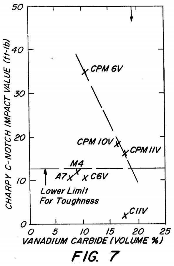 The patent [2] lays out the process of developing 10V relatively well. The goal was to maximize vanadium carbide content for high wear resistance without having so much carbide that toughness is low. The harder the carbides, the higher the level of wear resistance for a given amount of carbide. So a steel with hard 15% vanadium carbide has higher wear resistance than a steel with softer 15% chromium carbides. However, the toughness of those steels would be relatively similar assuming the carbide size is also similar. 10V was one of the first steels to be designed to avoid all other carbide types and to be made up of vanadium carbide only. This means that 10V could have a balance of toughness and wear resistance exceeding previously available steels due to the powder metallurgy technology which maintains a small carbide size with high vanadium additions, and a design that leads to only vanadium carbides in the heat treated steel.