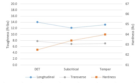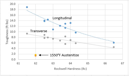 The temper anneal appears to have had slightly improved toughness-hardness balance but I am not sure if that is just a fluke of statistics. The full anneal is still my recommendation. In writing my book I calculated optimal annealing temperatures for different steels and for CruForgeV my estimate was 1405°F rather than the 1450°F given in the datasheet, because of the relatively low temperature at which cementite dissolves in the steel. So I would recommend annealing from that somewhat lower temperature. However, 1450°F works fine and is the same as the datasheet recommendation for O1 which is a steel that behaves relatively similarly in austenitizing. If annealing without a furnace, heat to non-magnetic and place in a slow cool media like vermiculite. You can read more about how annealing works in these articles: Part 1 and Part 2. Note: the chart below also shows “transverse” toughness which is somewhat lower than longitudinal. You can read about these different orientations in this article.