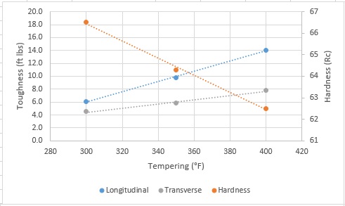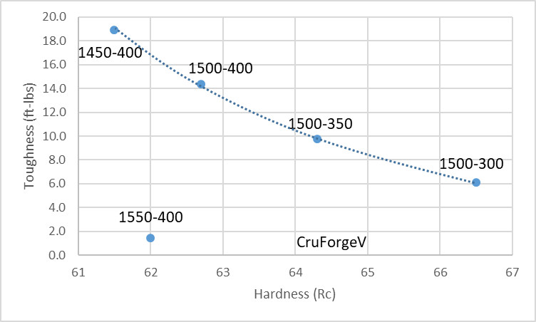 There was no major drop in toughness by tempering at 300°F, so it is safe to temper that low if higher hardness is desired. Some steels can show a sharp change in behavior below certain tempering temperatures, such as seen with 5160, but this was not found with CruForgeV.
