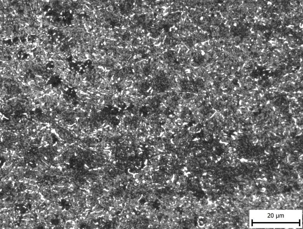 For conventional production we want to ensure that the carbide size remains relatively fine, so we would limit our additions of vanadium and tungsten to reasonable amounts. I like the combination used in Blue Super of 0.4% V and 2.25% W, those appear to be chosen at levels where most of the carbide is dissolved at forging temperatures for easier forging, but high enough where some VC/WC remains after final heat treatment for wear resistance. The issue with steels like Blue Super and 1.2562 is that they are prone to having high carbon in solution leading to brittle plate martensite and low toughness. The very high carbon content also makes the steel prone to grain boundary carbide formation during normalizing which also reduces toughness. Read this article for a process that was used to boost toughness in 1.2562.