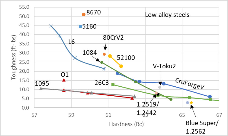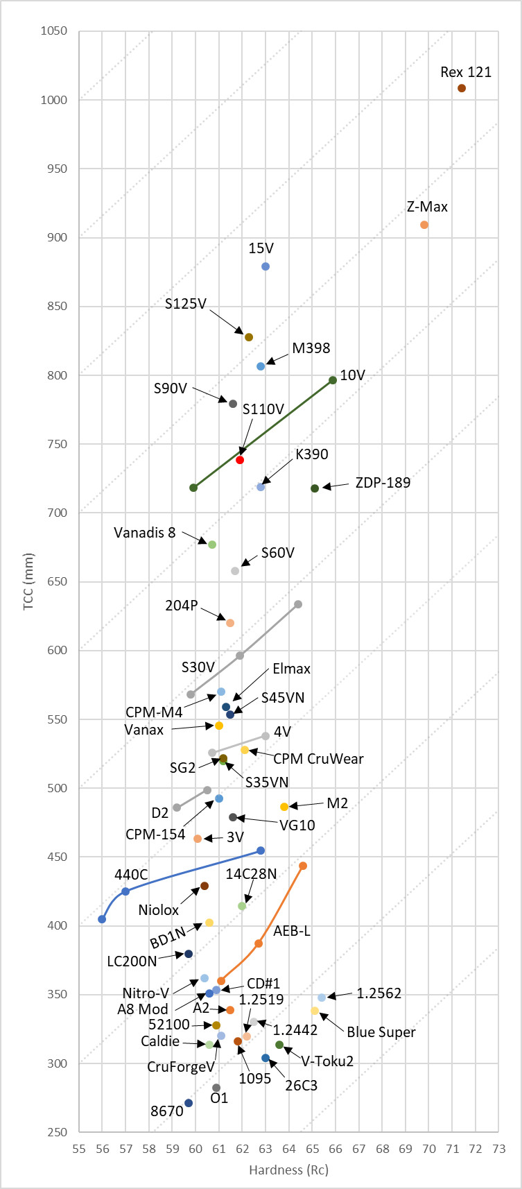 To get a low alloy steel more firmly competitive with stainless and high alloy steels in terms of edge retention, even higher levels of vanadium and/or tungsten would be required. For conventional production perhaps we could combine the 0.75% V in CruForgeV with the 3.2% W in 1.2562. That would give about 3.2% VC/WC for another boost in edge retention. We may be straddling the line of where bladesmiths would be willing to use the steel at that point, because of increased difficulty in forging and finishing.