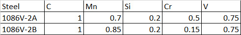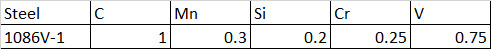 In 2006, a group of forging bladesmiths had a meeting with Crucible Steel representatives at the Blade Show. At that time, good sources for low alloy high carbon steels for forging were relatively difficult to come by. Many makers were reliant on steel parts like bearings or leaf springs to obtain steel because it was difficult to purchase new barstock. Sometimes these parts can be made with unexpected steels rather than 52100 or 5160, and instead have carburized low carbon steel or other surprises. Having a reliable source means you can have consistent behavior in forging, heat treating, and performance. Crucible had developed a reputation for making high alloy tool steels and stainless steels that worked well for knives but had never developed a steel specifically for forging. Forging bladesmiths generally want low alloy steels that are “easy” to forge and heat treat using traditional equipment like a forge and a hand hammer. 1086M steel, popularized by Howard Clark, was suggested to Crucible as a comparison point as a steel that worked well when forging knives. 1086M was similar to a 1084 steel but with somewhat lower manganese and an addition of 0.2% vanadium [1]. The low alloy content meant great ease in forging and the 0.2% vanadium helped with maintaining a fine grain size, as vanadium carbides “pin” grains so that they do not grow as quickly at forging temperatures.