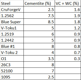Below I have a table summarizing the approximate carbide volume of some of these higher wear resistance forging steels where I combined the content of VC and WC. More carbide, especially hard carbides like VC and WC, mean higher wear resistance. CruForgeV is roughly comparable to steels like Blue Super in terms of VC+WC content, though with lower cementite.