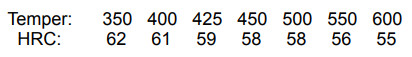 1450-400 results in excellent toughness around 61.5 Rc, while 1500-350 has good toughness while at high hardness for edge stability and edge retention.