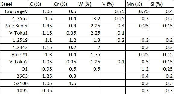The first one is 1.2552 (0.78-0.84C, 1.1Cr, 1.9-2W, 0.19-0.3V, 0.4-0.42Mn, 0.32-0.5Si, +Ni, +Cu). This is at least a Tungsten alloyed steel, that has less carbon than the other steels from your “thoughness of forging steels”-article. Therefore it should be tougher and have more lath martensite.