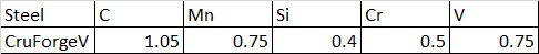 CruForgeV went through a few different iterations during development which used lab sized ingots to produce small amounts that could be tested for their behavior in forging and heat treating and the resulting performance as a knife steel. The initial composition was essentially 1086M but with added vanadium and enough carbon to form carbides with it, leaving the base steel relatively similar but with added VC. This makes the 1086V working name somewhat of a misnomer. This initial composition the bladesmiths found difficult to harden, as the 0.3Mn is even lower than the original 1086M, and increased carbon can also reduce hardenability with high carbon steels. This made the steel a “water hardening” grade. Jim Batson had difficulty getting consistent hardness with Chevron 70 oil (a “medium fast” oil), ranging from 56-65 Rc depending on location. Only up to 56 Rc with Brownell’s Tough Quench (medium oil), and 40 Rc with hydraulic fluid. Only water allowed it to reach 65+ in every location tested.