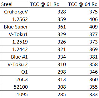 Overall I think they picked a pretty good compromise for hardenability with CruForgeV, making the steel less likely to air harden while also working with a range of different quenching oils. Blue series steels (#1, #2, Super), 1.2562, and 1.2442 have about 0.3Mn-0.3Cr, along with high carbon content, which puts them firmly in the “water hardening” category. V-Toku steels have a bit lower carbon and 0.5Mn-0.3Cr which puts them a bit closer to being “fast oil” steels though I think not quite there. 52100 (1.5Cr-0.3Mn) and 1.2519 (1.2Cr-0.3Mn) are “fast oil” steels, and CruForgeV is just above those in the medium oil category. So achieving full hardness after quenching can be somewhat easier than the Blue series steels and 1.2442, giving CruForgeV an advantage to some knifemakers.