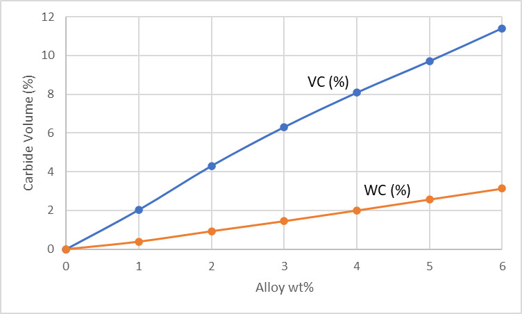 CruForgeV has a combination of cementite (iron carbide) and vanadium carbide. The amount of cementite is relatively low compared to other ~1% carbon forging steels because some of that carbon goes to forming the vanadium carbides instead. On paper, CruForgeV can appear to be less wear resistant than some of the tungsten alloyed steels like V-Toku1 and Blue #1 which have about 2% tungsten added to them. However, tungsten is a very heavy element, so 0.75 weight % vanadium is equivalent to about 3.1% tungsten when it comes to how much carbide is formed, as shown in the chart below.