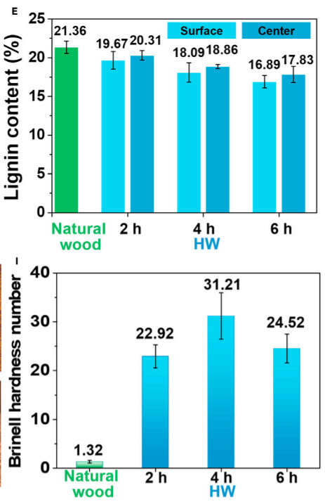 Instead by their own admission the hardness was correlated with the density of the wood, which peaked at the 4 hour treatment. After the chemical process, they did a cold press and hot press to the wood to increase its density. Therefore it is not clear how much of an effect the small reduction in lignin contributed or if it was primarily the increase in density, similar to other wood densification processes.