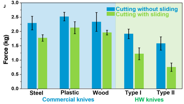 In fact they already found a wood butter knife to compare against that was available at a store, so already there is a lack of novelty to the wooden table knife application. The cross-section images of the knives already show that the hardened wood knives (labeled Type I and Type II) are going to beat the steel and commercial wood knives. The steel knife is intentionally blunted. It is not designed to cut things other than butter.