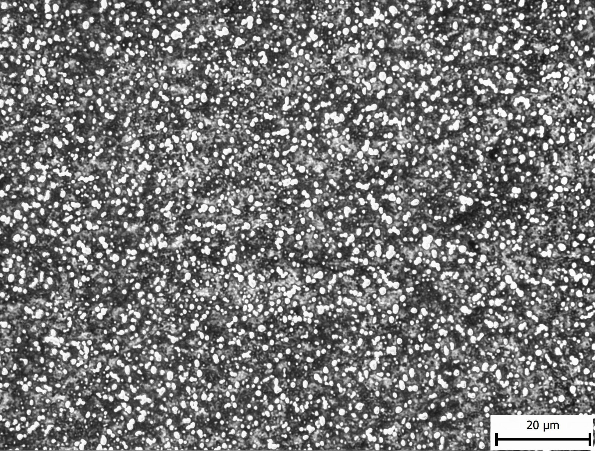 It has been found previously that vanadium nitrides coarsen more slowly than vanadium carbides which is why the nitrides are smaller in size [5]. With powder metallurgy steels the carbide size starts out extremely small in powder form and they slowly coarsen during the high temperature processing of hot isostatic pressing (HIP) which fuses the powder into a solid ingot, and then hot forging and rolling of the ingot into sheet. And indeed when we compare the heat treated microstructures of Vancron against the carbon-only CPM-10V and Vanadis 8, we do see that Vancron has significantly smaller carbides/nitrides: