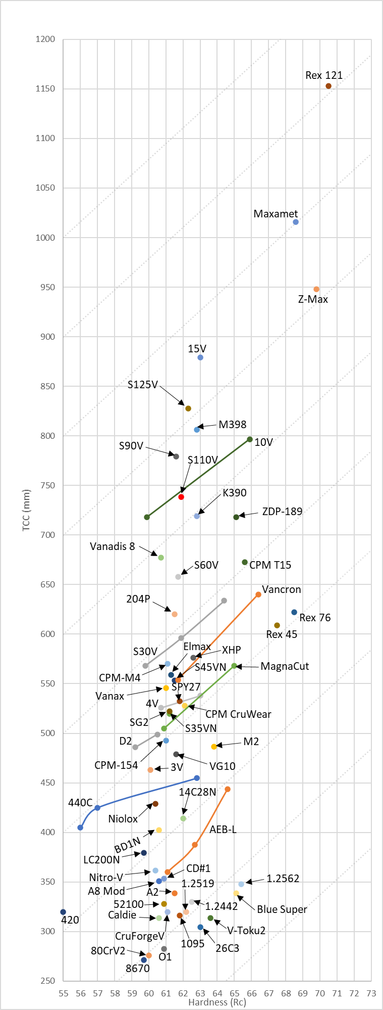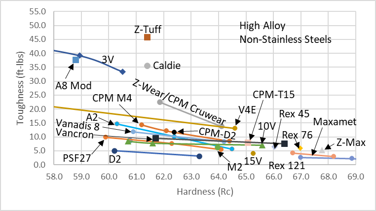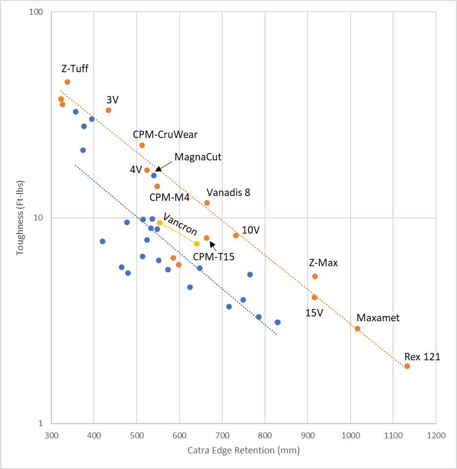 With lower hardness of vanadium carbonitrides than vanadium carbides this is limiting in terms of how high these nitrogen-vanadium steels can be. The toughness is largely controlled by the volume of the carbides/nitrides, and so if the carbonitrides are contributing less to wear resistance then the toughness-edge retention balance is reduced. That makes the carbon-vanadium grades like Vanadis 8, K390, and CPM-10V a better choice in terms of toughness-edge retention balance. This is somewhat disappointing because I had heard that Vancron was significantly easier to grind and sharpen than other 10% vanadium grades like CPM-10V and I thought Vancron might offer similar edge wear resistance to those grades but while being easier to work with; certainly that would be an attractive combination of properties.