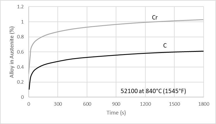 Example of change in carbon and chromium in solution with austenitizing time for 52100. With short soak times the changes are great, while after sufficient soaking the behavior is more flat.