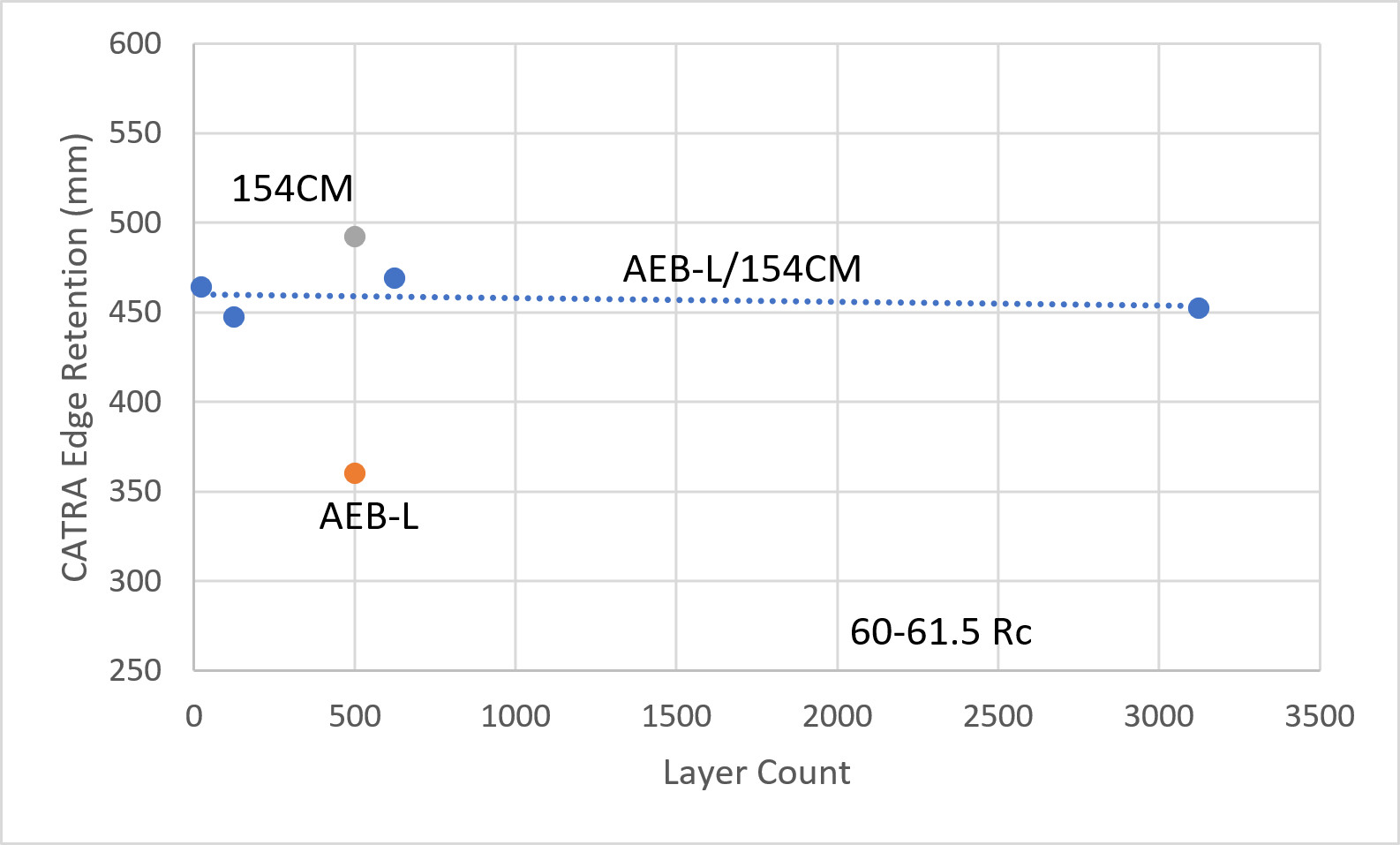 This carbide banding theory could be confirmed by testing CATRA edge retention of a single steel which was given ladder patterning. We effectively did this test already with the 3125 layer AEB-L/154CM where layers were no longer visible. We also tested layer counts of 25, 125, and 625. However, regardless of the layer count the edge retention was the same, as shown in the chart below: