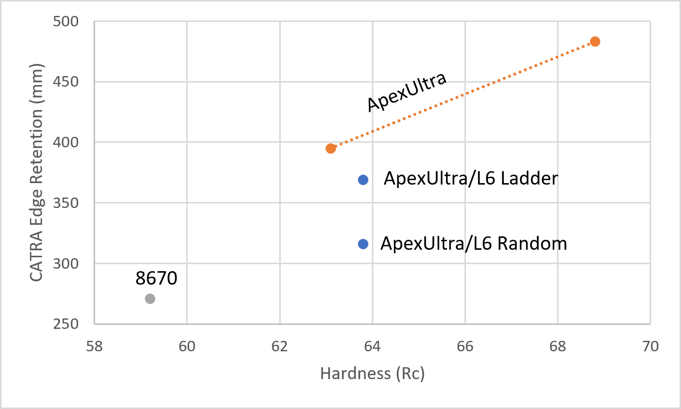 The edge retention was tested with the “Hugin” pattern which is essentially a “ladder” pattern which puts a wave into the steel. We found ladder patterned Damascus to have better edge retention than “random” straight layers as shown on the ApexUltra/L6 chart.