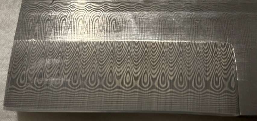RWL34 is the “bright” layer and PMC27 is the “dark” layer in the micrograph above. Because Damasteel is constructured with layering of powder, there can be somewhat diffuse transitions between the two steels, which on a small scale are not as sharp as in pattern-welded Damascus made with solid sheet steels. This does not appear to have any deleterious effect on the “macro” pattern observed in the final material.