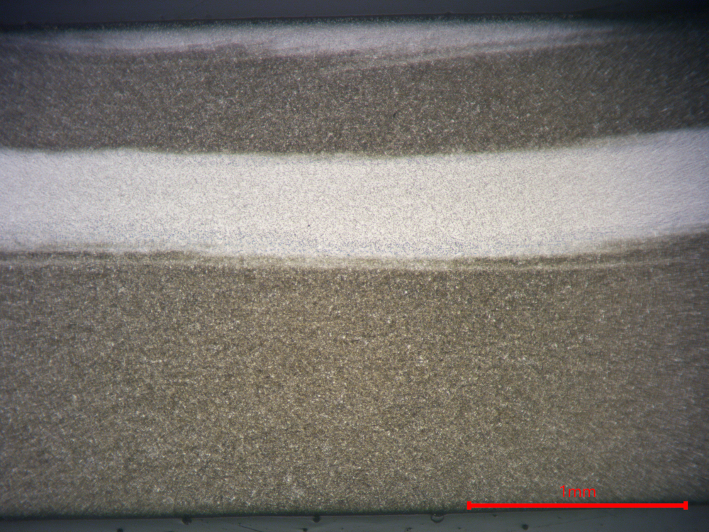 Thus it appears that the effect of the layers is minimal, and most of the effect comes from the change in shape of the microstructure instead. There is still directionality to the microstructure, especially carbide banding, which would have its shape changed through the ladder patterning. Below is an image of carbide banding: