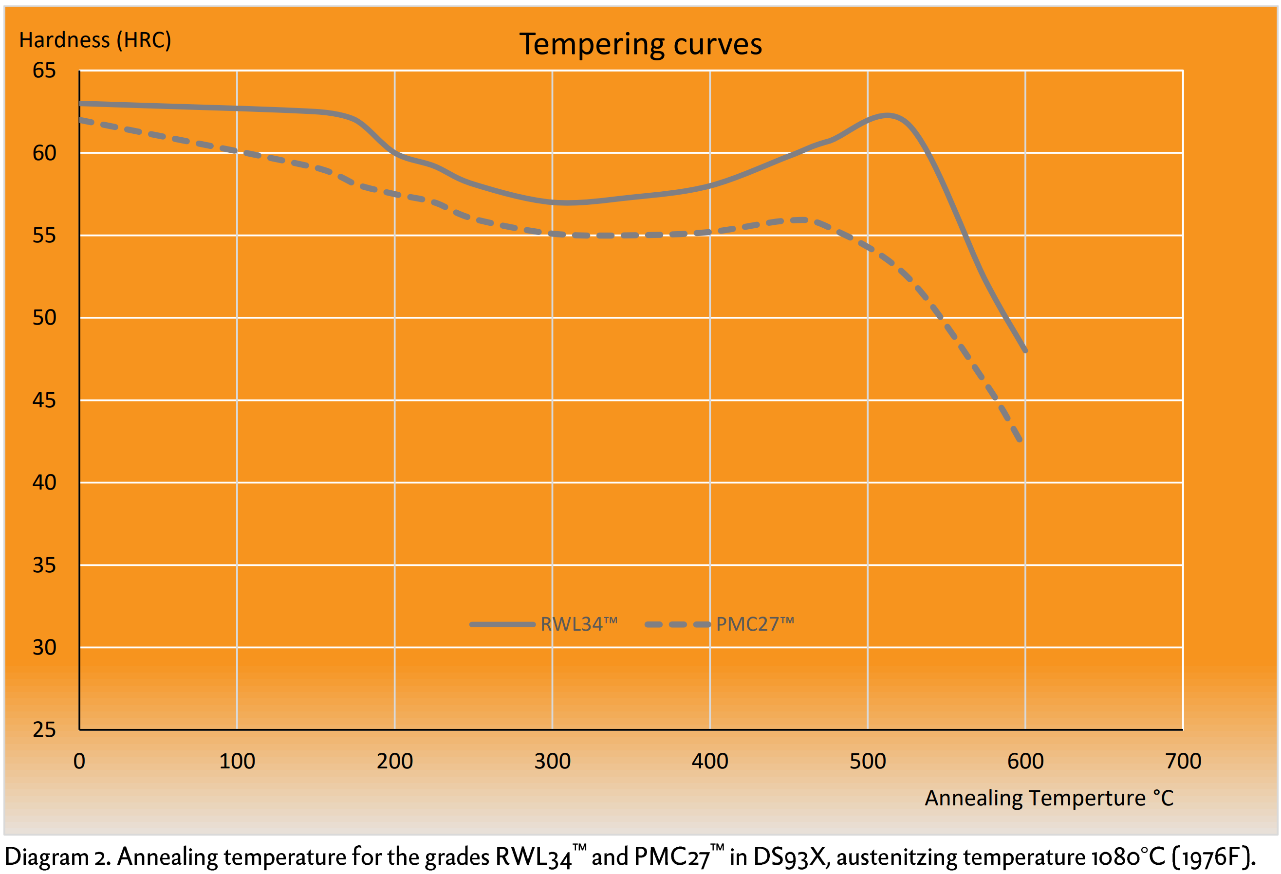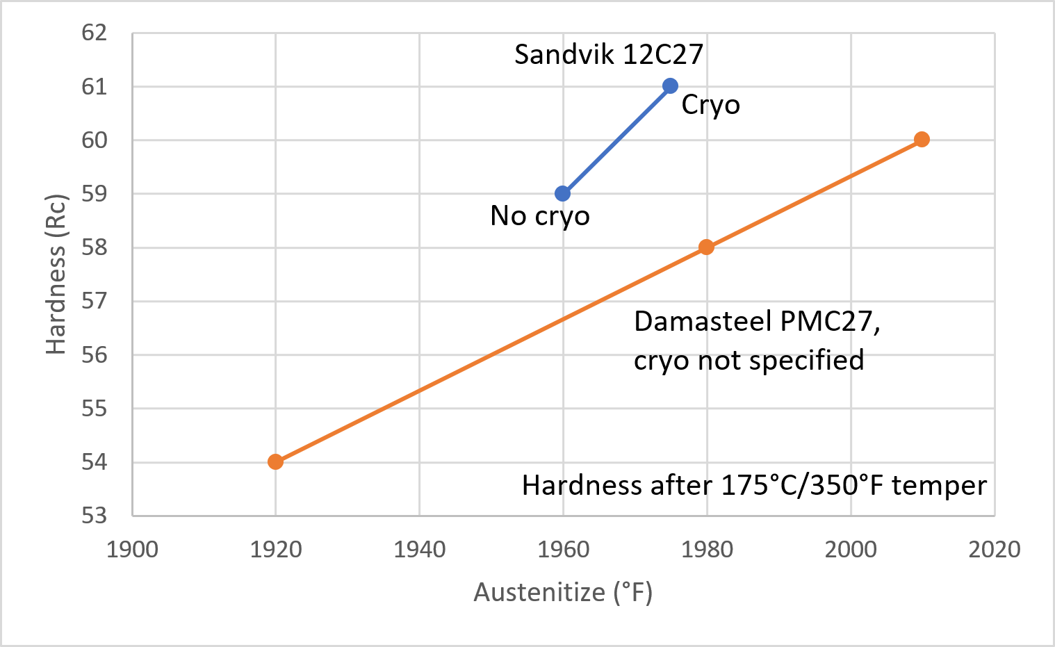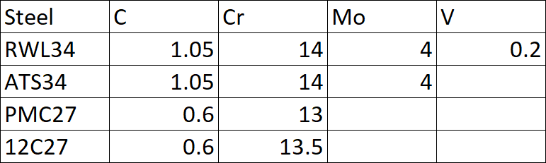 Comparison of Sandvik 12C27 and Damasteel PMC27 heat treatment data.