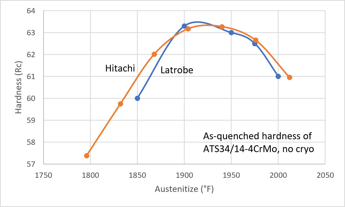 Note also that the hardness drops without cryo above 1925°F, which is why I recommend limiting the austenitize to 1925°F when cryo is not available. This is in line with other heat treatment data from Hitachi and Latrobe on ATS-34, as shown below. When “overaustenitizing,” the hardness drops from excessive retained austenite. Cryo can transform some or all of this retained austenite so that hardness will climb with even higher austenitizing temperatures. Excess retained austenite, even if the final hardness is acceptable (ie 60 Rc), will lead to poor performance, as the retained austenite is very soft and will lead to deformation at lower stresses than would be seen at the same hardness without the retained austenite. The steel will deform as if it is at a significantly lower hardness. You can read more in this article on cryo.