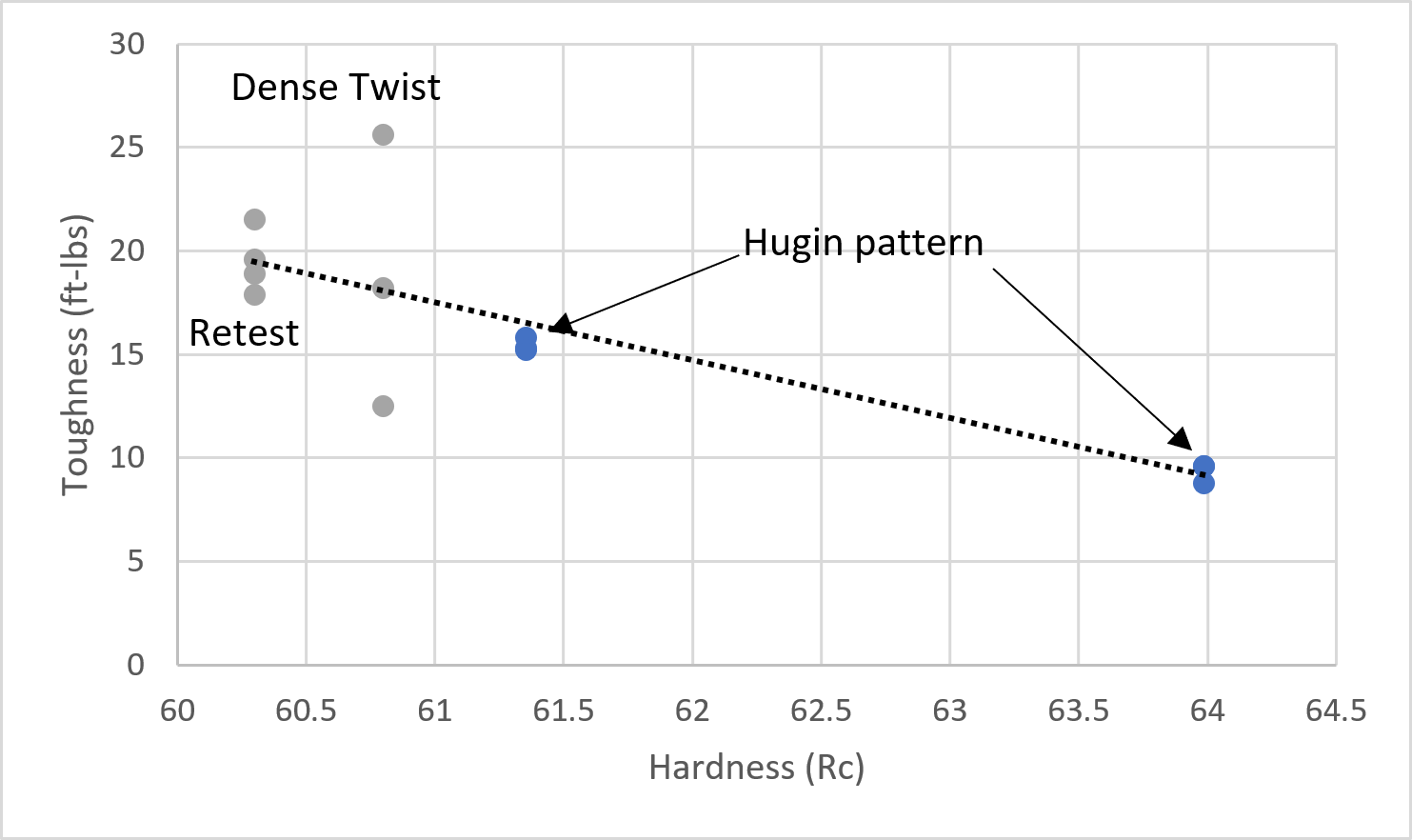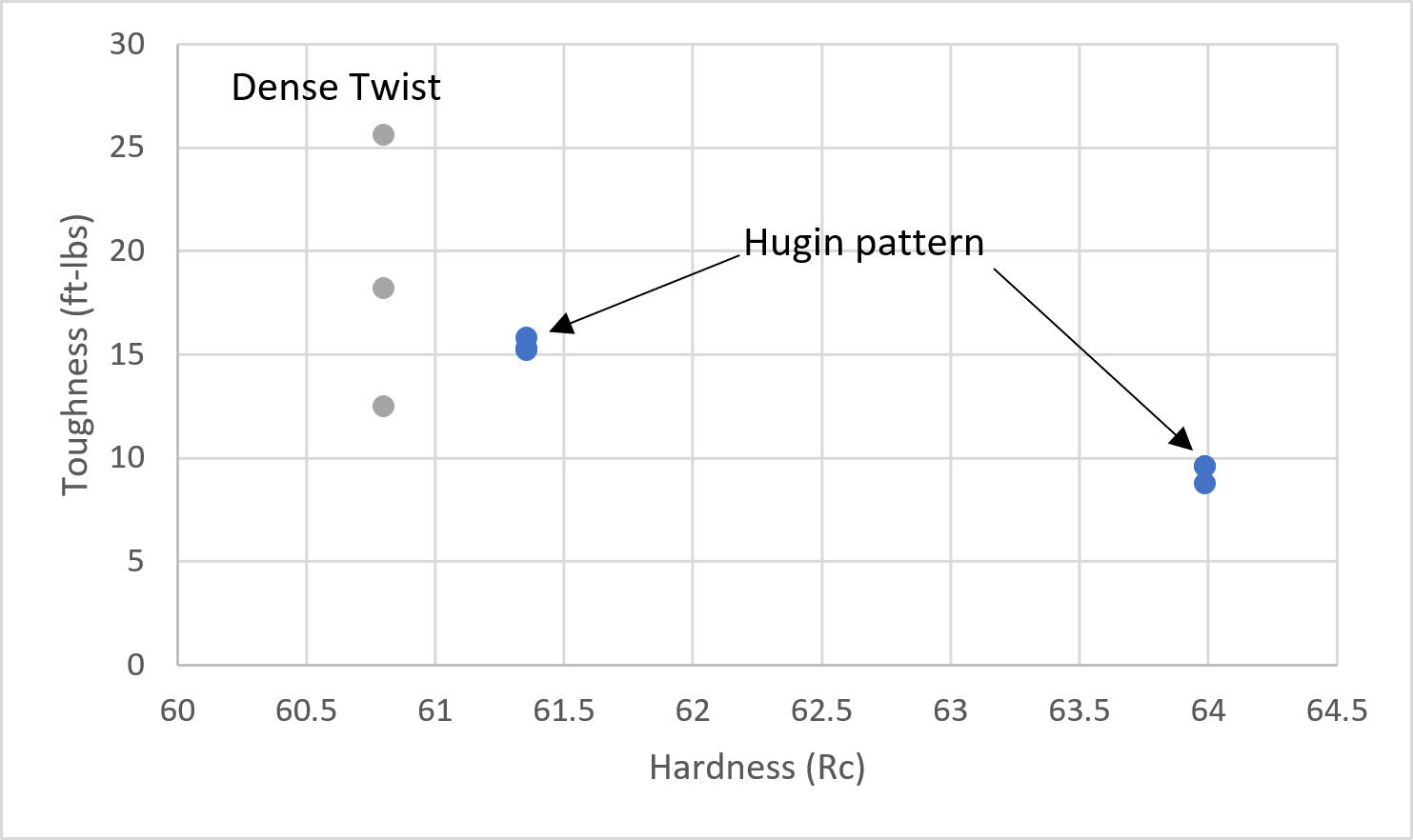Because of this unexpected behavior, I made four more coupons and retested, and this time the behavior was more consistent. The average toughness did not change that much, however. It appears that when compensated for hardness the toughness was roughly the same between the dense twist and the Hugin pattern.